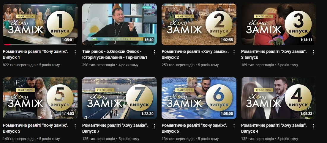 Найпопулярнішими на каналі “Тернопіль 1” досі є випуски програми “Хочу заміж”, випущені 5 років тому. Скрин: YouTube-канал “Тернопіль 1”