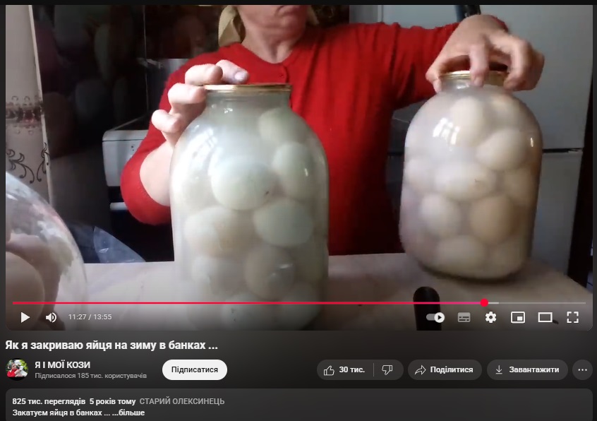 Відео про консервацію яєць на зиму зібрало за п’ять років понад 825 тисяч переглядів. Скрин: YouTube-канал “Я і мої кози”